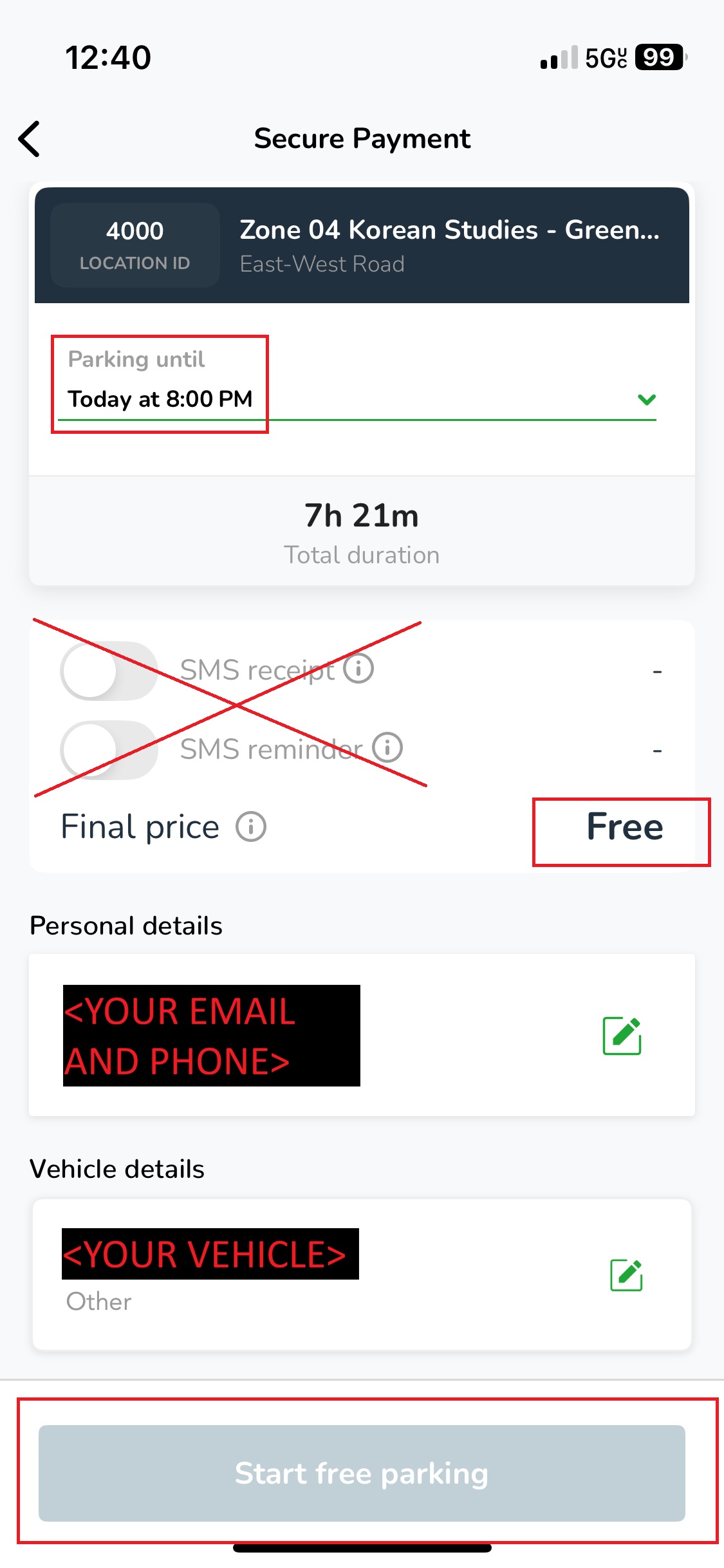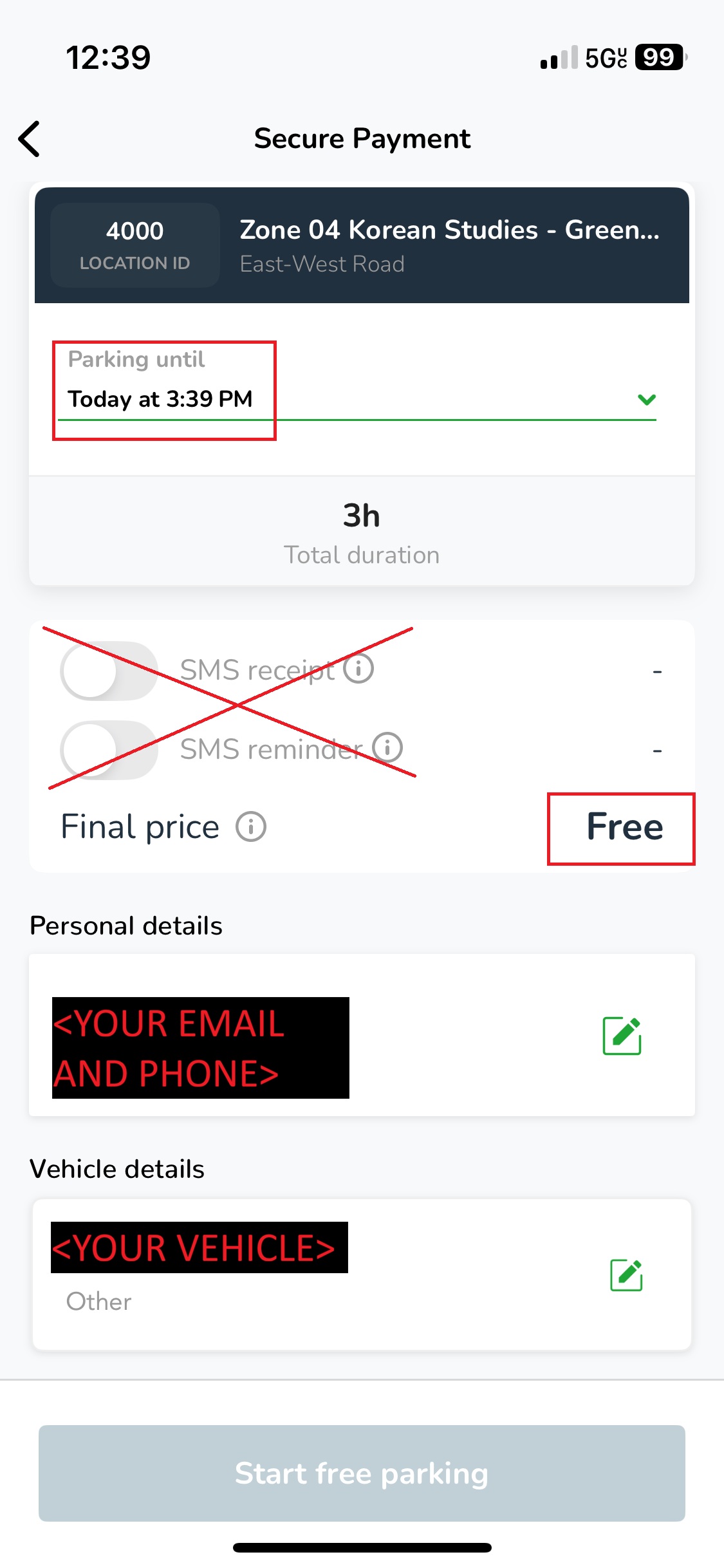 To start your parking session, you must click on the button “Start free parking”. Your booking will start, and you will move to a screen with additional parking info.